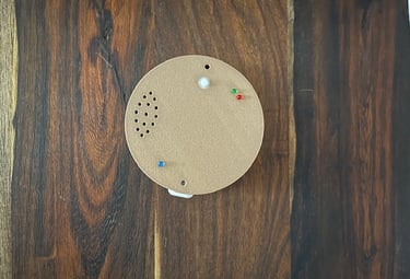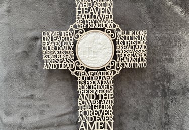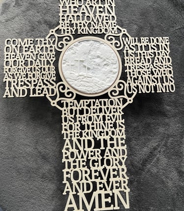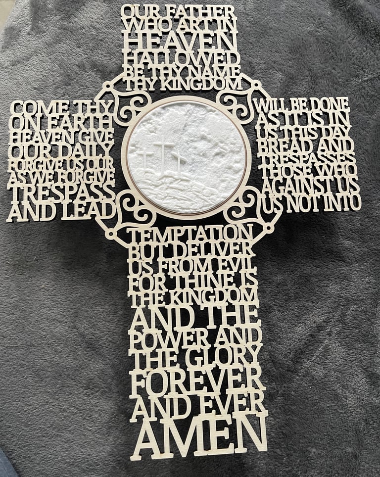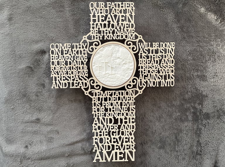 The Lord’s Prayer is precisely etched into warm, natural wood, complemented by a compact electronic module that brings the scripture to life.